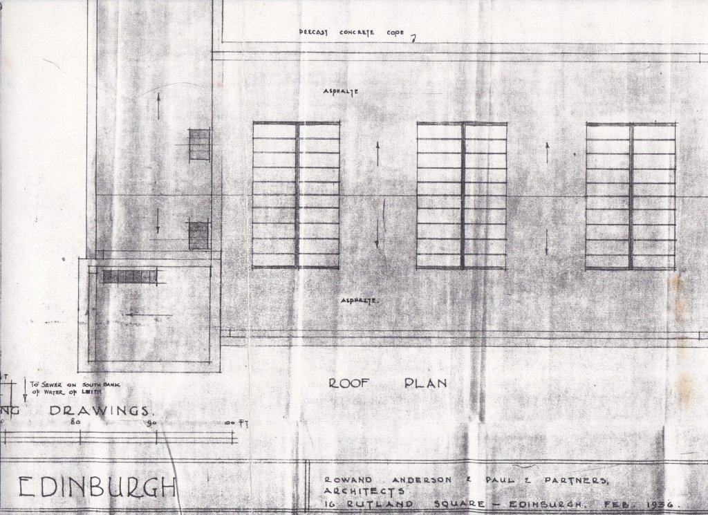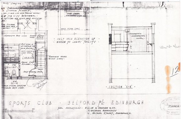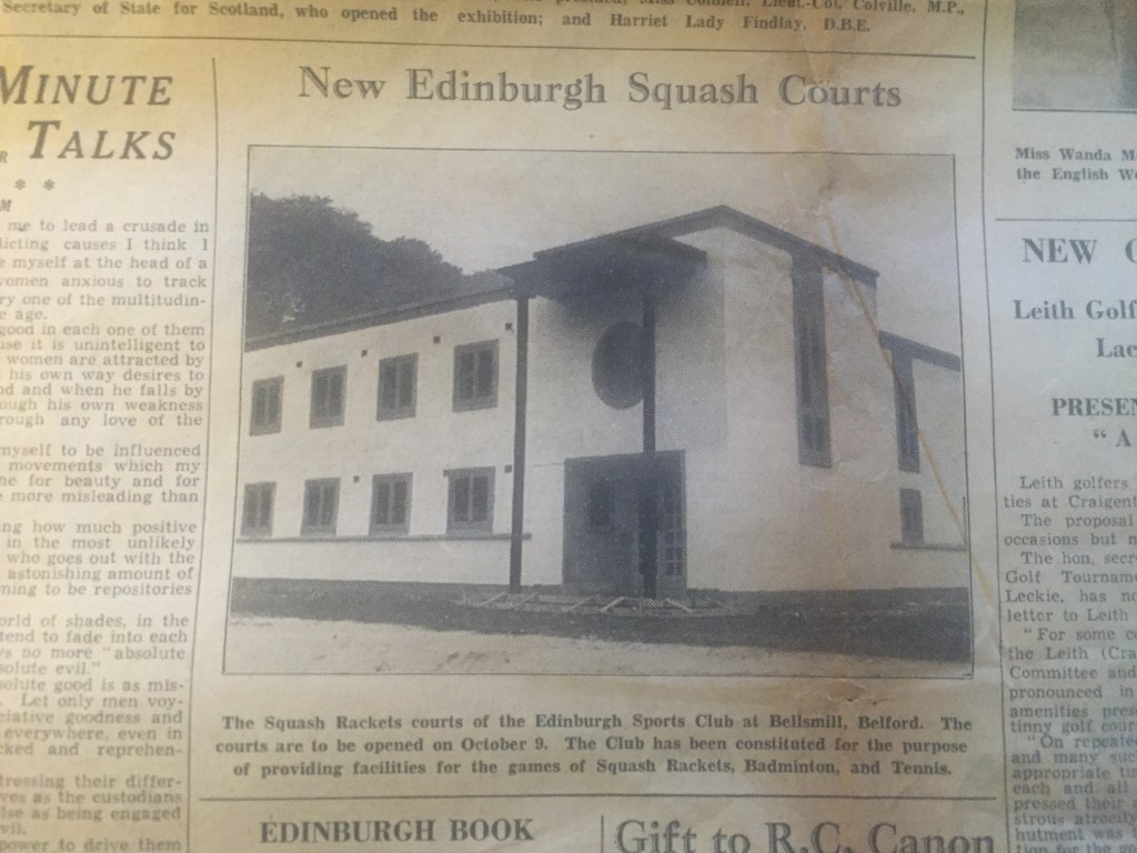 The Architects were Rowand Anderson and Paul, a notable Edinburgh organisation at that time. Prior to Arthur Paul being added to the company name (in 1921), Rowand Anderson was well known for designs including the McEwan Hall, The Scottish National Portrait Gallery and Glasgow’s Central Hotel. Basil Spence and William Kinnimonth joined the company in 1934, and Arthur Paul died in 1938, so some or all of those three were no doubt responsible for the design, which is evidently more sophisticated than the average Squash Club building, with several Art Deco features. Among the interesting features of the first development are creation in both Ladies and Men’s changing rooms of what would now be called showers. In those days they were referred to as ‘Spray’ Rooms. Also note the small scale of the Admin. facilities – restricted to just one small room – 7 feet by 6 feet – for the Professional (although there was ‘Committee Room’ on the first floor) – so where was the bar? Extra lockers were also shown in the lower courts corridor. The cost of the project is noted in the 1986 history as being £9,000, although the value of heritable property is shown in the 1946 accounts as being £11,834, and that sum may (indeed should) represent the cost of building to that date which would have comprised both the 1936 and 1937-38 projects. Your editor believes that a fairer cost of each of those projects is nearer £6,000 each.
