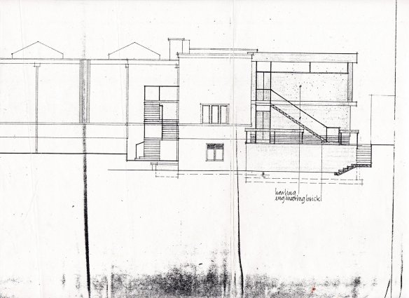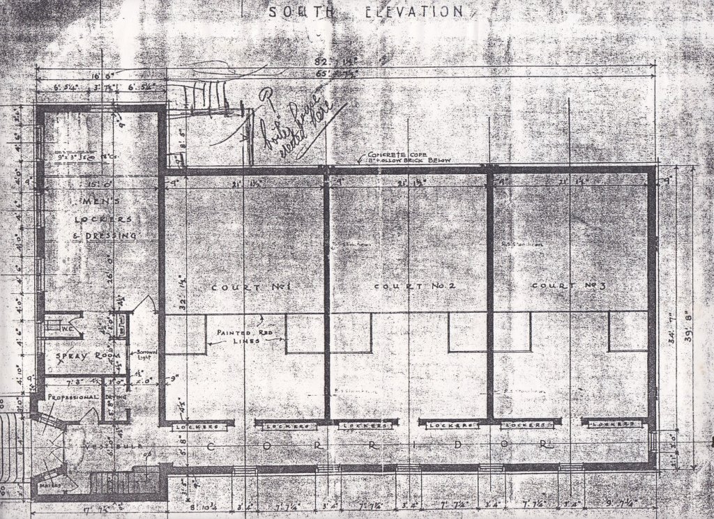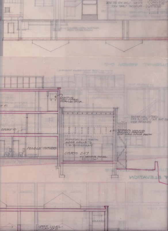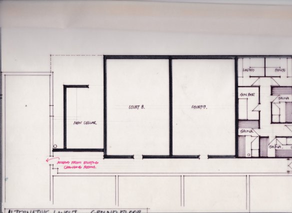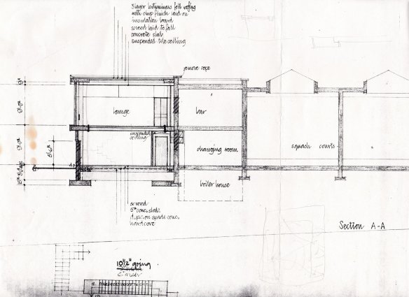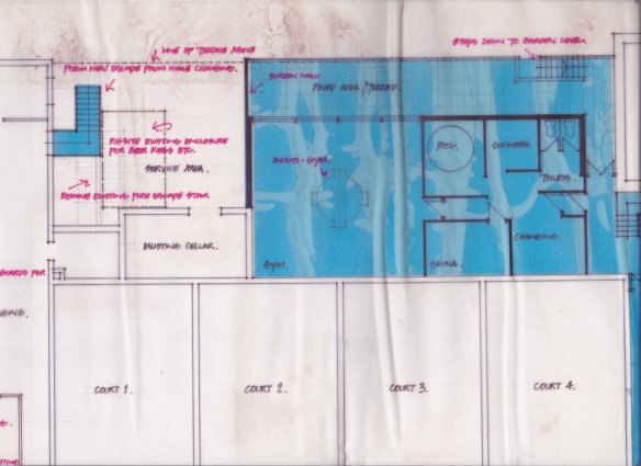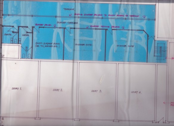 In the meantime, all that remains is a sketch drawing, reproduced below. Among the controversial (and complicated) changes are the conversion of court 3 into reception and the main access staircase. The reduction of one court was balanced by the creation of two further courts (8 and (9) tacked on to the west elevation of the club. View a larger image here