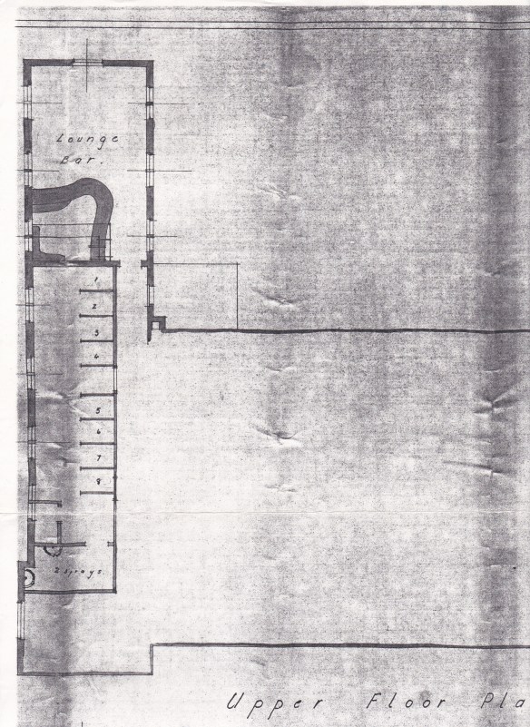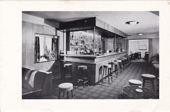 There is but one drawing, but it clearly shows the deletion (hatched lines) of the quarter-circular ‘cocktail bar’, and the creation of the bar as we know it today. Also created was a dinette area, and a lounge area where the kitchen currently resides. At this stage, the cellar was the room behind the bar, and as someone pointed recently out, there is no fire escape ! That was to arrive around 1965 (q.v.) For a full scale photo, click here