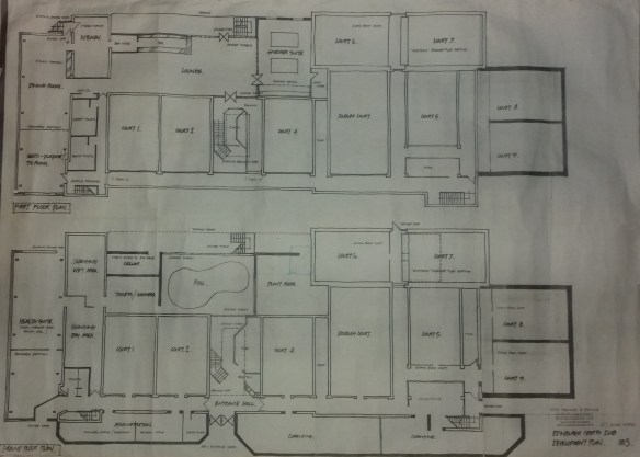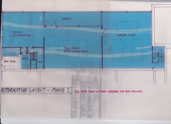 Further plans are shown in the slideshow below, and appear to be modifications of the ‘Comprehensive’ plan. The development of the Garden/BBQ area is there, but some of the changes to the East of the building are more modest. The complexity of the changes and their relationship are somewhat difficult to comprehend. In any case, in the event, none of it happened, but it may well have been the precursor to the ‘Open competition between Architects’ of around 1990 which saw the the plan involving the Gym, semi-circular main staircase, and Ladies changing moving the east end of the building.