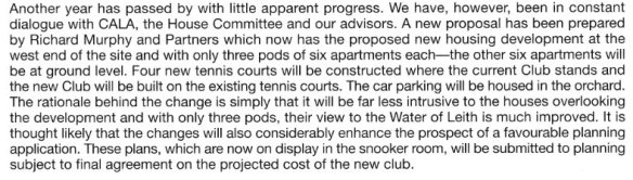 - The 1996 bid by a notable Edinburgh developer to create a much enhanced product, at what would have been much increased subscriptions. The project failed largely when the Company owner realised there was no room for parking after all the new developments had taken place