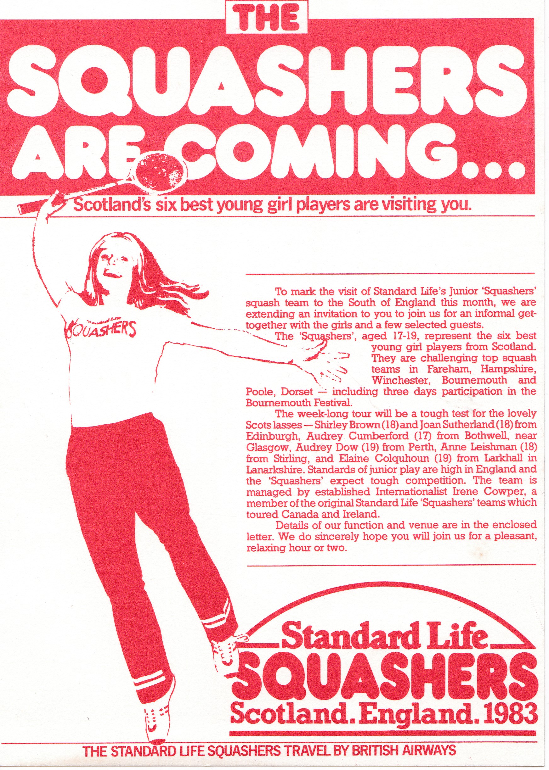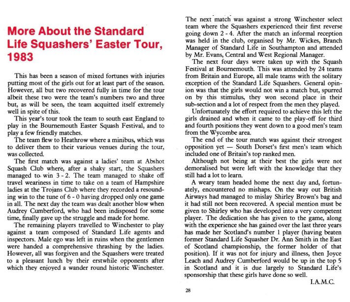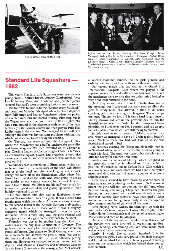 Irene Cowper has her name writ large over the foundation of this splendid touring group, but the editor has thus far been unable to determine the nature of the original contact. Safe to say, it was a good one, at a time when Standard Life were riding high in the Life Assurance business, and were also keen to promote squash, particularly for talented juniors after the first couple of trips. We’ll publish a paragraph for each year, with supporting text from Standard View, the house magazine at the time.