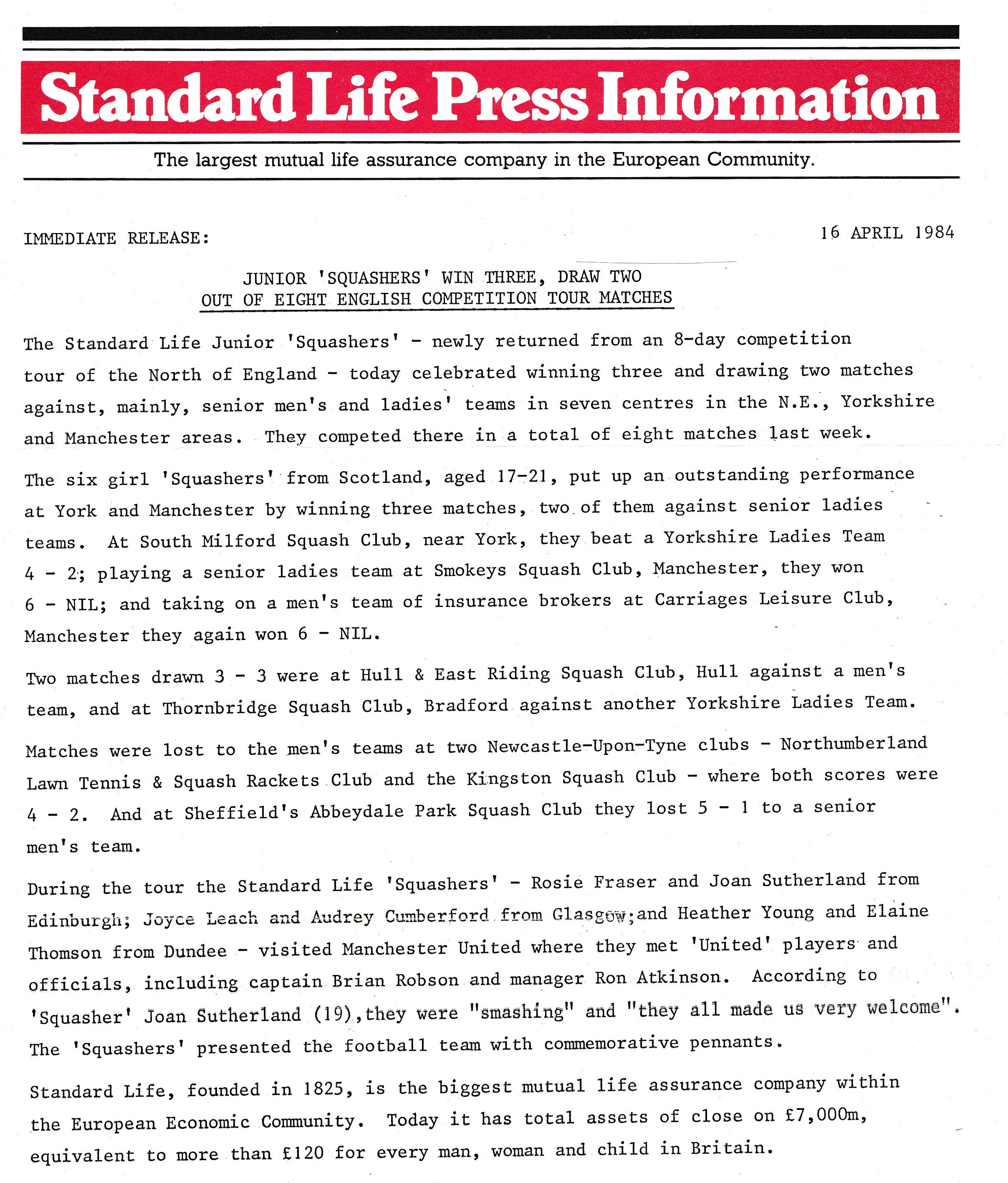 The 1984 Tour took in York, Manchester, Bradford, Sheffield, and two Newcastle-Upon-Tyne Clubs, Northumberland and Kingston, with a total of eight matches being played. The team had a commendable record, winning three, drawing two, and losing three, two of which were to Men’s teams in Newcastle. But it wasn’t all squash – they went to Manchester United FC where they met the players including Captain Brian Robson, and Manager Ron Atkinson. Read a full report of the tour.