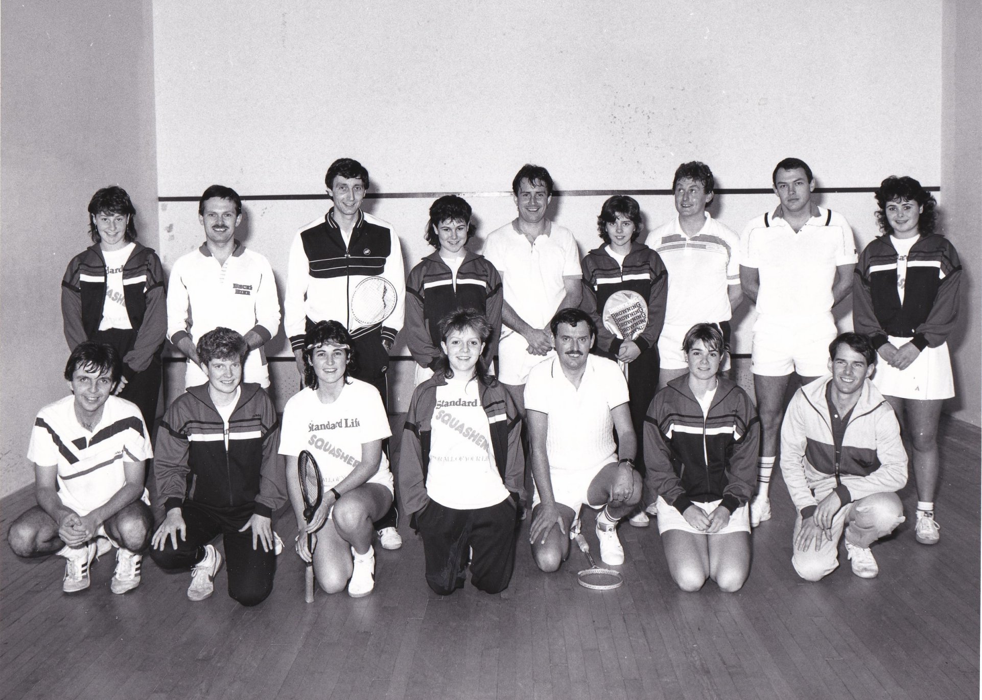 The photo shown here was taken at Edinburgh Sports Club sometime in 1986, and shows a nine-a-side match between a Standard Life select Men’s team, and the Squashers, played at ESC. Colin Robertson, third from the right in the front row was spotted by the Editor, and revealed the origin of the contest.