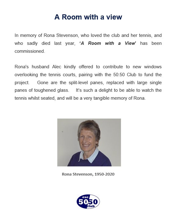 The 50 50 club currently has around 70 shareholders holding a total of around 140 £5 shares, generating a gross income of around £700 per month. Fifty percent is paid as prizes, and fifty percent retained for distribution to good club causes. The constant recipients are the Annual 50 50 Junior tournament, and the ‘ESC Foundation’, a scheme in which pupils from local state schools are given a day of mixed coaching in the racket sports. Other grants have included a defibrillator, tennis ball launcher, very large TV, bar upgrades, new fire doors and a series of large photographs for the lower squash courts hallway. The latest grant was a 50% share of the installation of full-height windows in the lounge and dining room, to create ‘A Room With A View’, in memory of Rona Stevenson who sadly died in 2020. Over £35,000 has been distributed as prizes during the 9 years of the scheme (as at 2020), and the same amount has been distributed as grants.